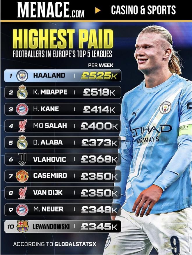 最近Menace.com發布了“歐洲五大聯賽周薪最高球員”名單,哈蘭德和姆巴佩排在最前面,凱恩、薩拉赫、范戴克、諾伊爾這些名字也都在榜上。同樣是周薪幾十萬英鎊,有人這段時間靠進球和助攻把身價打出來,也有人因為出場和狀態起伏很難對得上這份工資——這份榜單里,誰才是真的“花得值”?(數據截至2026年1月12日法甲日報)